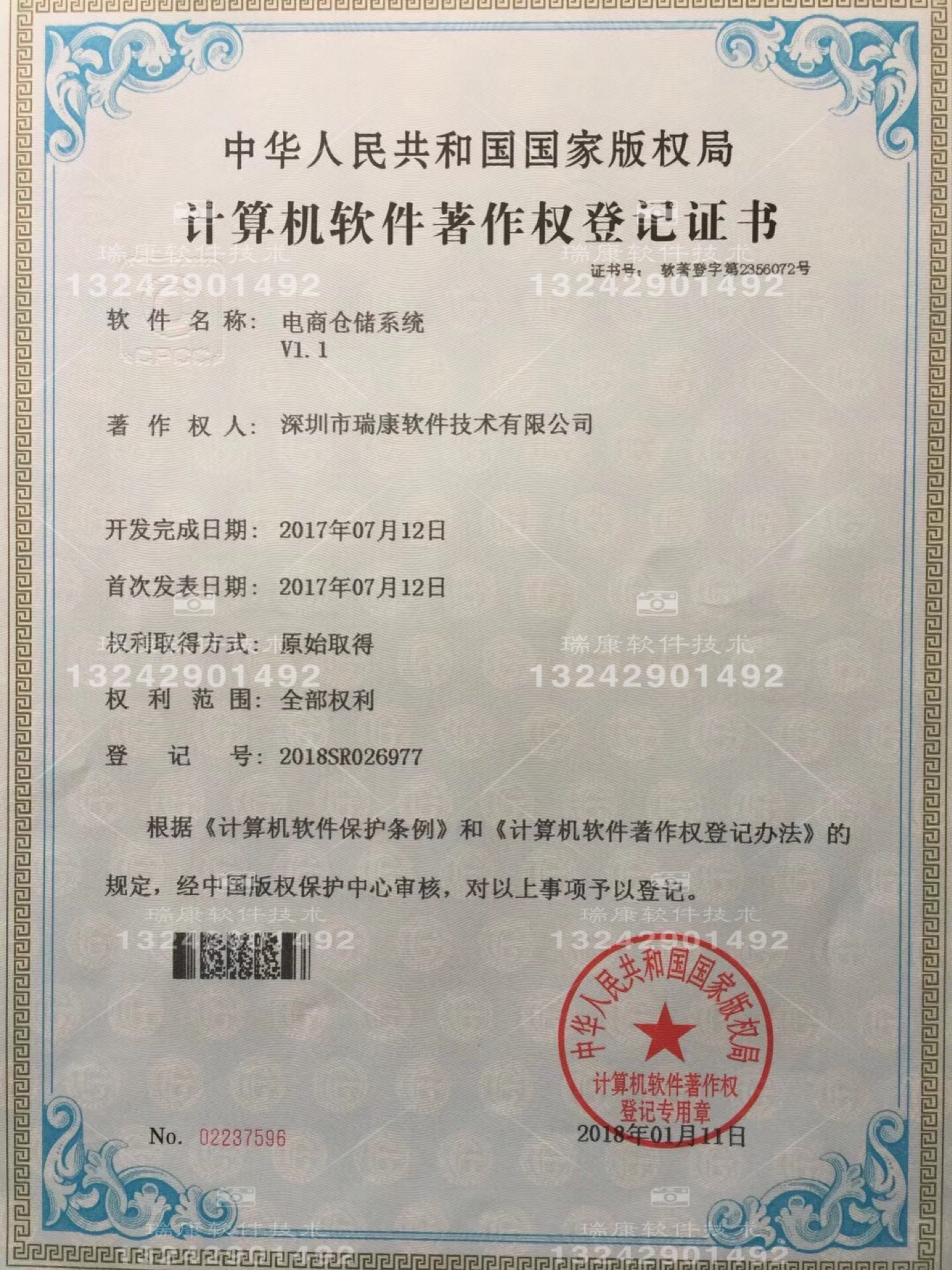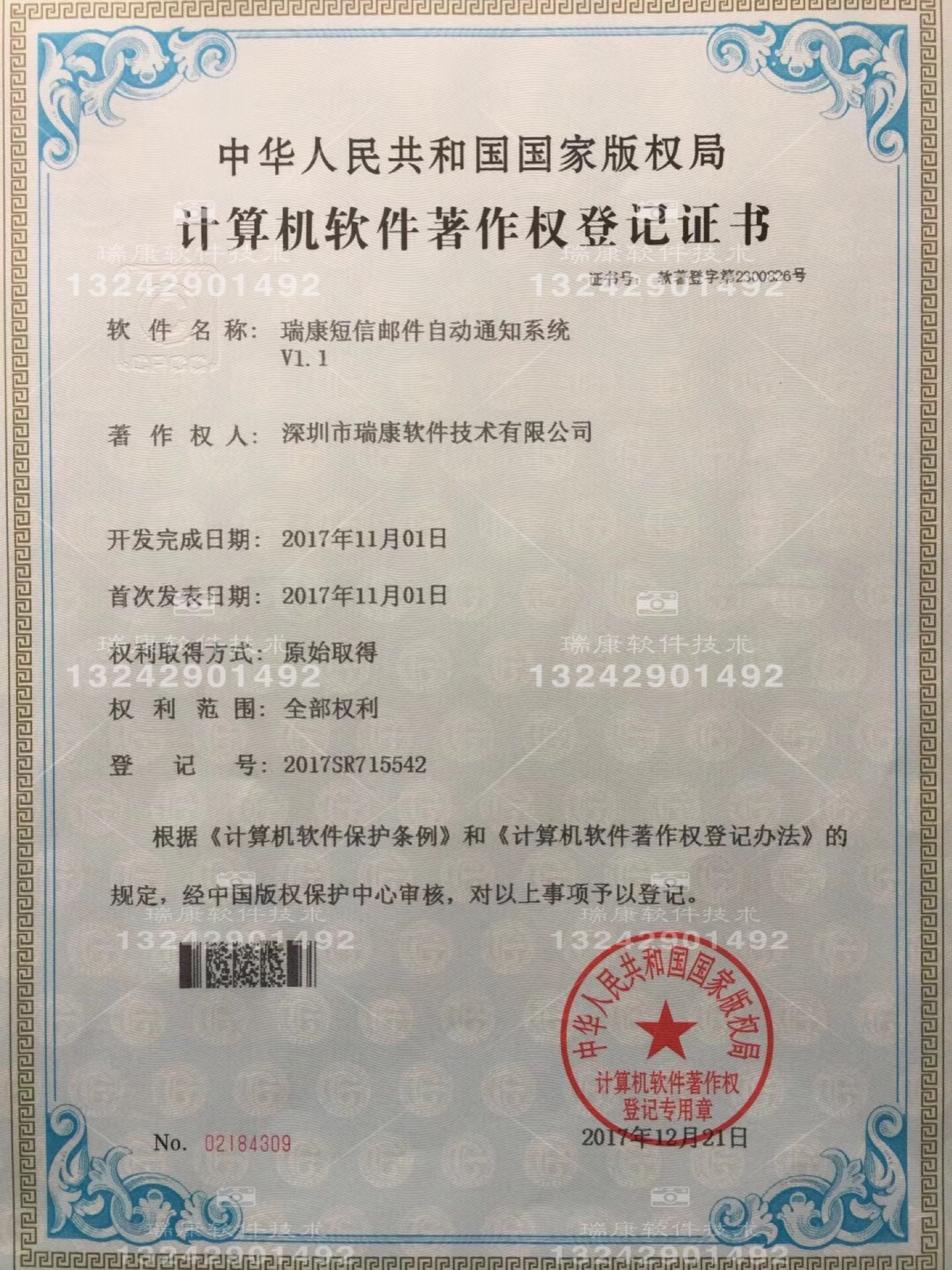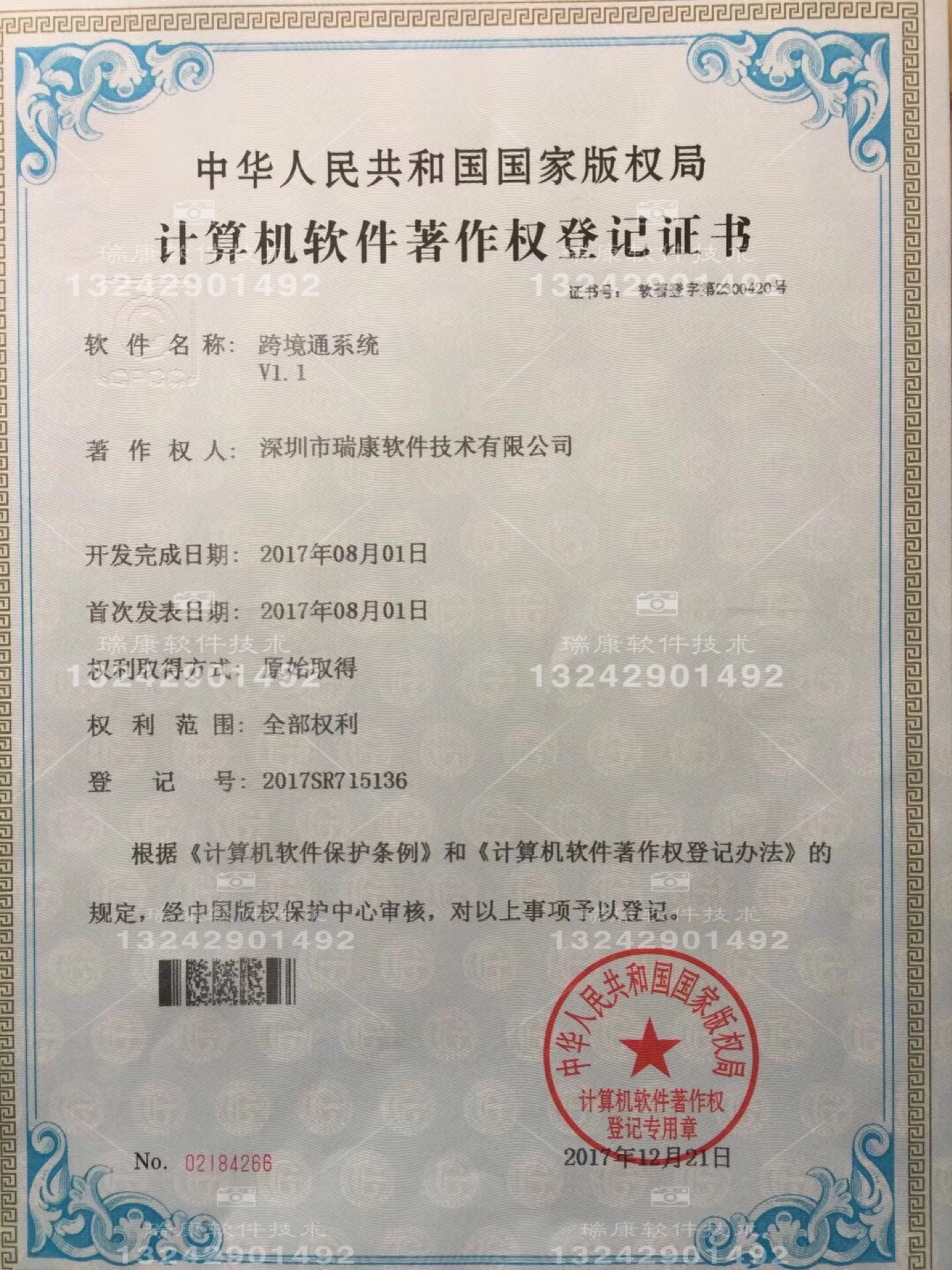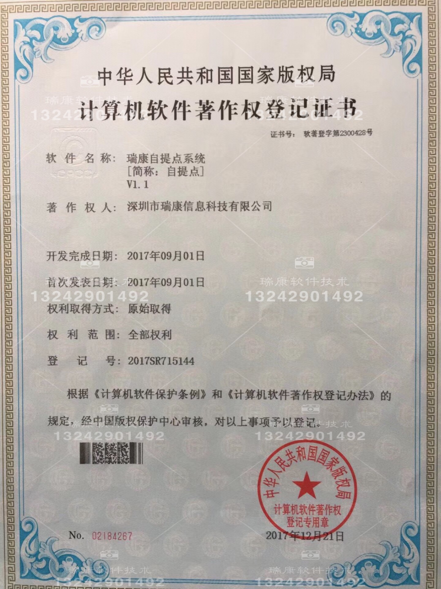 根據《計算機軟件保護條例》和《計算機軟件著作權登記辦法》的規定和中華人民共和國國家版權局的考證,日前,“瑞康科技”再次榮獲計算機軟件著作權登記證書。